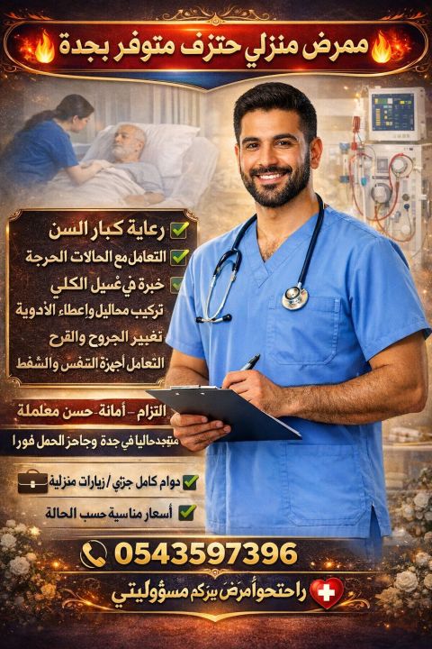 ممرض منزلي محترف متوفر في جدة ممرض خبرة 5 سنوات في التمريض المنزلي ورعاية المرضى رعاية كبار السن التعامل مع الحالات الحرجة خبرة في غسيل الكلي تركيب محاليل واعطاء الادوية تغيير الجروح والقرح التعامل مع اجهزة التنفس والشفط التزام - أمانة - حسن معاملة متواجد حاليا في جدة وجاهز للعمل فورا متاح دوام كامل / جزئي / زيارات منزلية أسعار مناسبة حسب الحالة للتواصل