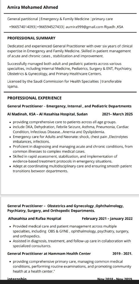 أنا طبيبة عامة سودانية معي سنة خبرة في المملكة وإقامة سارية جاهزة لنقل الكفالة فورا