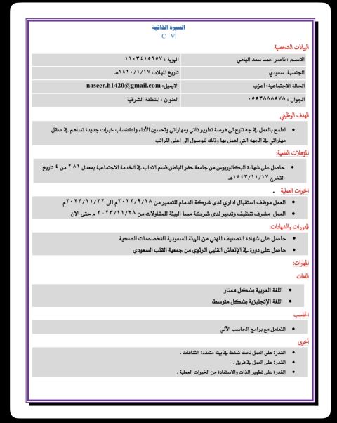 وبركاته تم تخرجي من جامعة حفر الباطن بتخصص خدمة اجتماعيه بمعدل 2.81 من 4 بتقدير جيد جدا ولدي خبرات عمل وقد عملت في شركة الدمام للتعمير بمسمى استقبال لمدة 18 شهر وعملت بشركة مسا البيئة للمقاولات العامة بمحافظة النعيرية بمسمى مشرف تدبير وتنظيف