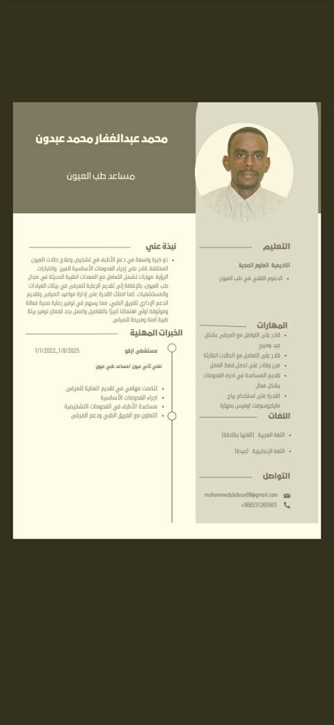 I am Mohammed Abdelghaffar, holding a Technical Diploma in Ophthalmology. I have experience in vision testing and assisting ophthalmologists in performing eye examinations and surgeries