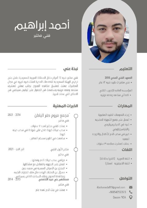فني مختبرات طبية خبرة 13 عام داخل السعودية حاصل على ترخيص الهيئة السعودية للتخصصات الصحية عملت في ملف سيباهي كمشرف سلامه ومكافحة العدوى حاصل على شهادة الاوشا أخصائي سلامة وصحة مهنية مرفق السيرة الذاتية خبرة كبيرة في المختبرات الميكروبيولوجي