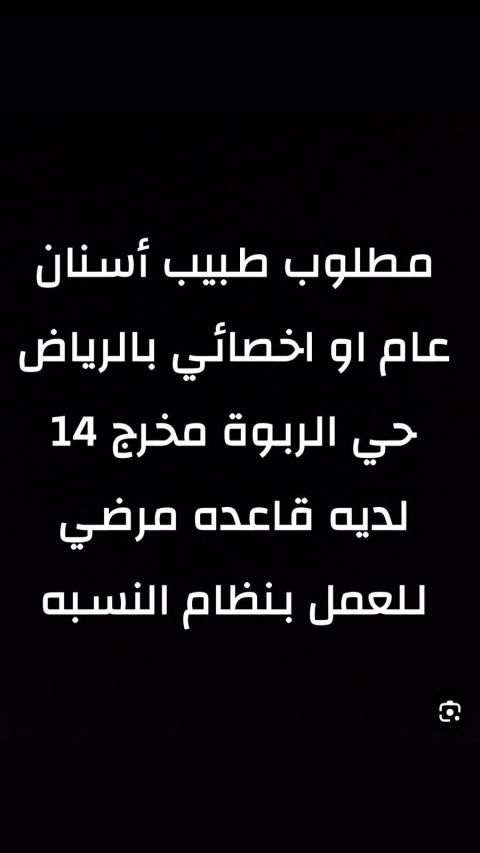 طبيب أسنان عام أو أخصائي في الرياض مخرج 14 حي الربوة لديه قاعدة مرضي للعمل بنظام النسبة