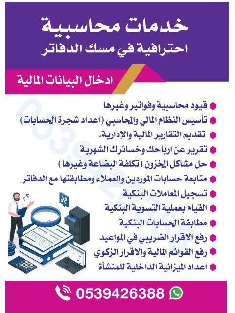 ابحث عن دوام جزئي في الرياض. محاسب سوداني خبرة لأكثر من 11 سنة متخصص في تأسيس الأنظمة المحاسبية وشجرة الحسابات، ومسك الدفاتر واعداد القوائم المالية والتقارير المالية، عمل القيود اليومية ومطابقة حسابات العملاء وكشوفات البنوك، اعداد الرواتب ورفعها على حماية الأجور، رفع الاقرارات الضريبية والزكوية، والتحليل المالي لخفض التكاليف وزيادة الايرادات والعمل على مختلف البرامج المحاسبية