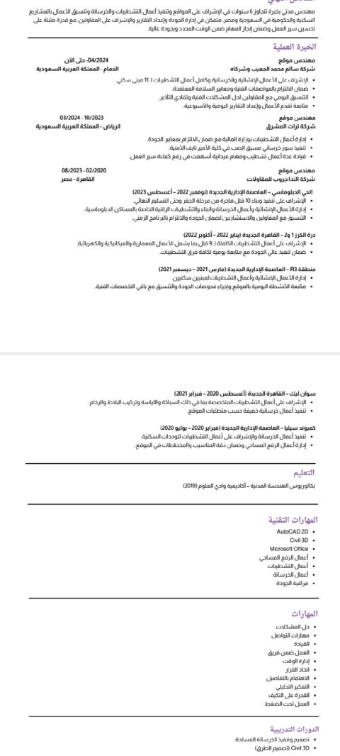 Sudanese Civil Engineer with more than 8 years of experience in concrete works and finishing works. Member of the Saudi Council of Engineers, holding a valid driving license and transferable Iqama. Highly skilled in site execution and preparation of shop drawings using AutoCAD, quantity take - off using PlanSwift and Excel, in addition to following up project schedules. Seeking a suitable job opport