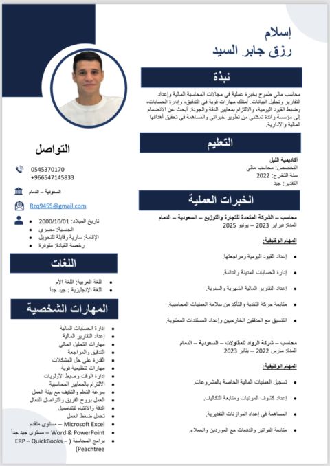 ابحث عن فرصة عمل محاسب لدي خبرة في متابعة وادخال العمليات المحاسبية والدورة المستندية الكاملة بدقة أجيد العمل على الأنظمة المحاسبية Odoo وQoyod، وبرامج Microsoft Office، بالاضافة الى التعامل مع نظام نقاط البيع Foodics لإدارة المبيعات والمخزون إقامة سنة، مقيم الدمام خبرة سنتين ومتاح لنقل الكفالة. رقم الجنسية مصري كلية تجارة جامعة الأزهر
