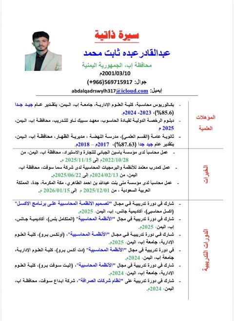 محاسب يمني ابحث عن فرصة عمل داخل المملكة. امتلك خبرة عملية منذ نهاية 2022 في الترحيل المحاسبي، التسويات البنكية، اعداد المطابقات، مراجعة الذمم، متابعة المخزون، اعداد نقاط البيع، وتحليل البيانات المالية بدقة، أحمل بكالوريوس محاسبة، وأتقن أنظمة ERP كما عملت كمدرب لأحد الأنظمة متقن Excel، ولدي قدرة على تنظيم العمل وضبط العمليات. جاهز للعمل فورا أتميز بالدقة ومتابعة الاجراءات المحاسبية وتحسينها