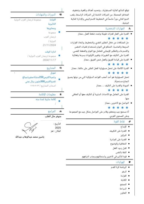 محاسب ابحث عن فرصة عمل في الرياض أو باقي مدن المملكة. حاصل على خبرة جيدة في المحاسبة واعداد التقارير المالية، واجادة العمل على أنظمة ERP وبالأخص نظام Odoo. متمكن من استخدام برنامج Excel في اعداد الجداول، والتقارير التفصيلية. أتميز بالدقة والالتزام بالعمل، مع قدرة على تحليل التكاليف ومتابعة الحسابات بدقة عالية