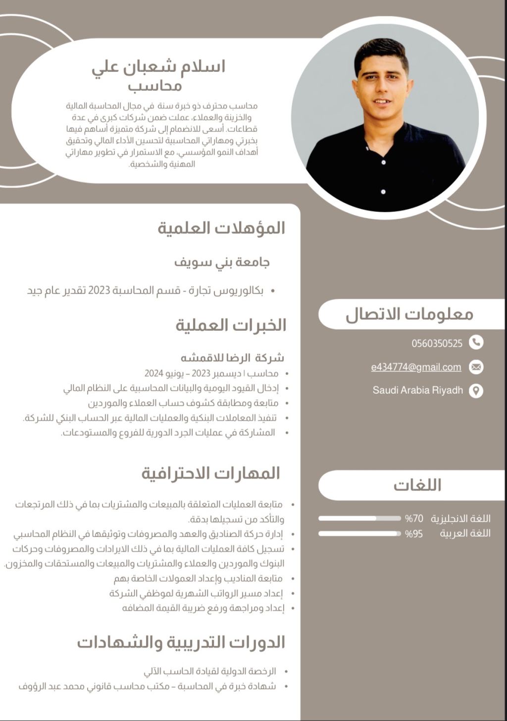محاسب مصري حديث التخرج أجيد ادخال كافة البيانات باحترافية فواتير مبيعات ومشتريات والقيود اليوميه وضريبة القيمة المضافة وتصفية العهد متابعة الايرادات والمصروفات وتسجيلها بدقة إقامة سارية سنة كاملة متاح لعمل مقابلة شخصية في أي وقت