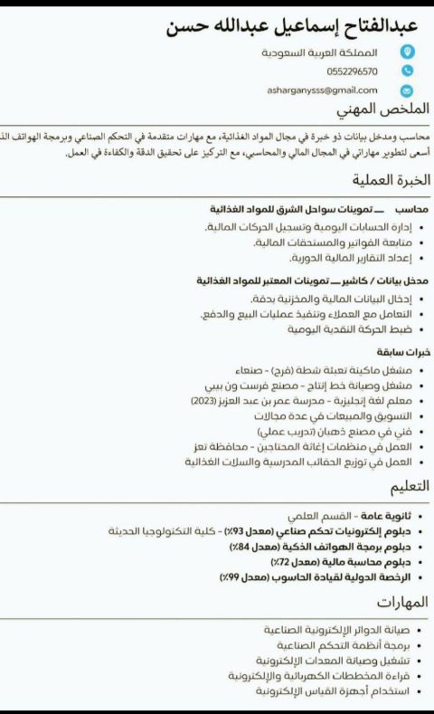 محاسب مالي وأخصائي موارد بشرية خبرة أكثر من 10 سنوات بالمملكة في الإدارة المالية والمحاسبية واعداد القوائم والتقارير المحاسبية اللازمة والتحليل المالي باستخدام برامج مايكروسوفت والعمل على برامج المحاسبة المالية وبرنامج الأمين وبرنامج أودو ودفترة وقيود وحاصل على شهادة اوراكل المالية والعمل ع جميع المنصات الحكومية ولدي سيارة خاصة وإقامة سارية ومتاح نقل كفالة وجاهز للعمل بأي مدينة بالمملكة
