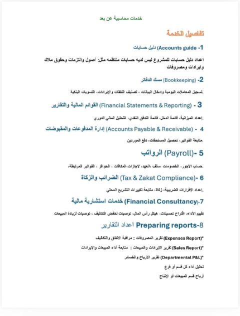 محاسب محترف يدير حساباتك بدقة وكفاءة عن بعد وبأقل تكلفة دون الحاجة توظيف دائم خدماتنا تشمل اعداد وتنظيم القيود اليومية والسجلات المالية. اعداد القوائم المالية والتقارير الشهرية. تسجيل ضريبة القيمة المضافة واعداد الاقرارات الضريبية. تسويات البنوك والموردين والعملاء. مراجعة الحسابات وتحليل الأداء المالي. حوكمة المصروقات وتقليل النفقات