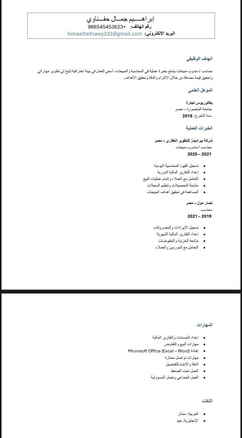 محاسب، خبرة ممتازة في تسجيل المبيعات والمشتريات، متابعة النقدية والتسويات البنكية، متابعة حسابات العملاء والموردين وتسوية الفواتير المستحقة، اعداد تقارير المبيعات والمصروفات دوريا، متابعة المخزون اذا موجود ومقار نته بالسجلات، اعداد الاقرارات الضريبية بشكل دوري. والعمل علي برامج سواء كان أكسيل محاسبي أو Erp (Odoo، daftra) system، بالاضافة الى إقامة سارية وقابلة للنقل