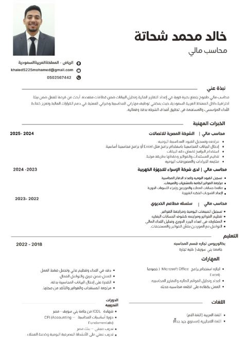 أنا شاب مصري طموح ابحث عن فرصة عمل تناسب خبرتي في المحاسبة المالية وإدارة التكاليف تحليل البيانات لتحسين الربحية ومراقبة التدفقات وإدارة المخزون وتنظيم الجرد وموظف موارد بشرية والخدمات العامة في كل ما يخص مسير الرواتب وانشاء عقود العمل الخ. أتميز بالدقة والالتزام بالمواعيد وقدرة على العمل الجماعي مع حرصي على تطوير مهاراتي باستمرار أطمح بيئة عمل حضارية تسعيللتطويرالنمو