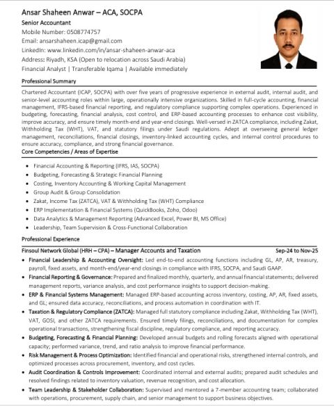 Peace be upon you, I am an accountant with five years of experience, including one year in Saudi Arabia, specializing in GL, AP/ AR, bank reconciliations, payroll, month - end & year - end closing, Zakat & income tax, GOSI, EOSB, VAT, and ERP systems (Odoo 18, Zoho, SAP B1) I am currently in Saudi Arabia with a transferable Iqama and available to join immediately. My CV is available upon request