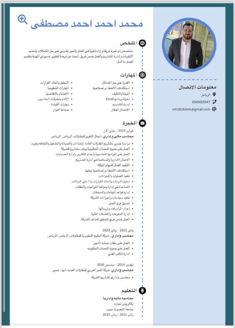 أنا محاسب تكاليف ومالية (مطاعم، كافيهات فنادق) اعداد ومتابعة تكلفة الأصناف، اعداد القوائم المالية الشهرية والسنوية، تقارير شهرية للادارة (رواتب، مصروفات الكاش شيت الخزنة) اعداد الاقرارات الضريبية وتقديمها، متابعة المبيعات والمصروفات بدقة، متابعة تطبيقات التوصيل ومراجعة الفواتير، امساك المنصات الحكومية (قوى، ابشر أعمال، التأمينات الاجتماعية، رواتب) خبرة في برامج (أكسيل، فوديكس، وافق ERP، رواء ERP)