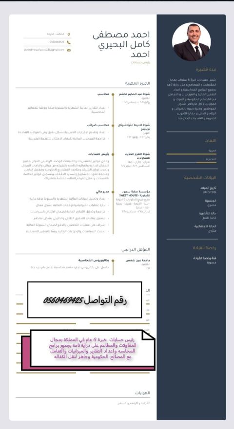 محاسب عام مالي واداري خبرة أكثر من 10 سنوات داخل المملكة خبرة بالبرامج المحاسبية والمنصات الحكومية رفع ضريبة القيمة المضافة الزكاة والدخل
