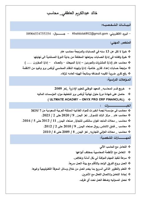 محاسب أول خبرة 9 سنوات خبرة. في اعداد الاقرارات الضريبي ورفعها د موقع الذكاة والدخل. اعداد قيود اليوميه ميزان المراجعة والتسجيل بالبرامج المحاسبية. خبرة بتأسيس شجرة الحسابات في البرامج المحاسبية لي لمؤسسات والشركات / عداد كشوف المرتبات ورفعها عد منصة مدد. خبرة في مطابقه البنوك وعمل التسويات البنكية بشكل شهري خبرة بمطابقه حساب الموردين والعملاء ومطابقة العهد وعمل التصفيات للعهد بشكل دوري