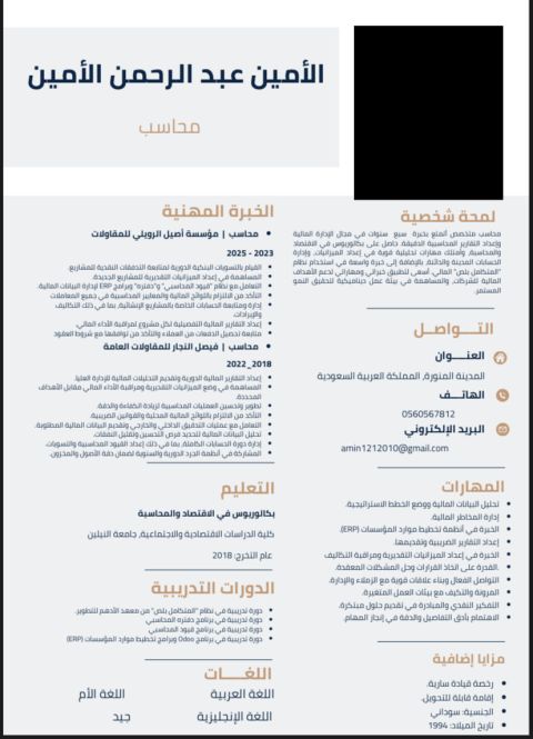 محاسب سوداني الجنسية ابحث عن عمل محاسبي أو ذو صلة لدي خبرة 5 سنوات في محاسبة المقاولات مجتهد وملتزم بالعمل إقامة ورخصة سارية