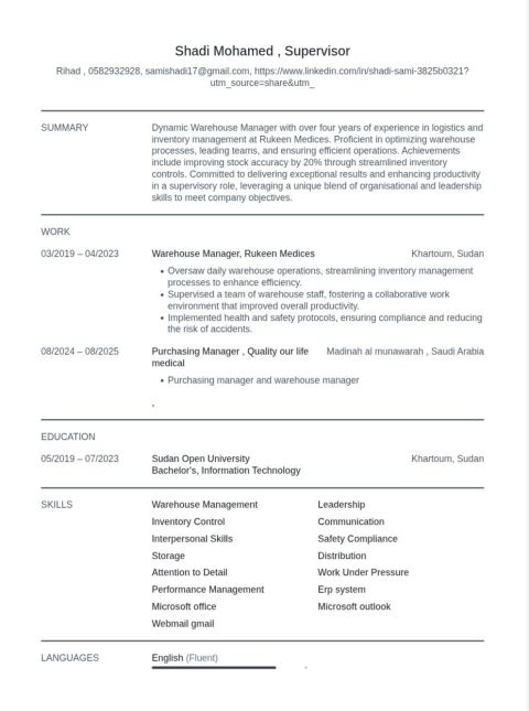 اداري ومبرمج ومتابع حركة مخزون ومدخل بيانات اعمل بحرص واتقان اشتغلت على نظام ديناميك finance and operations في قسم سندات القبض وقسم التعويض وقسم تحويل طلبات الشراء بين الفروع مع خبرة في البرمجة. net سي شارب وفيجوال بيسك ومعرفة بقواعد البيانات sql server تصميم وبرمجة تطبيق جرد بلغة الجافا اندرويد معرفة ببرامج الأوفيس (الاكسل، الاكسس) مستوى انجليزي يقارب المتوسط