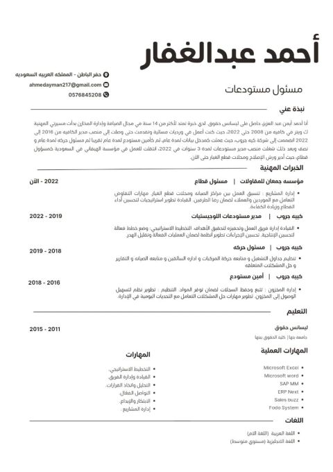 مسؤول وثائق يتمتع بخبرة تزيد عن 5 سنوات في توثيق المشاريع والإدارة وإدارة الوثائق عبر مشاريع بارزة متعددة خبير في استخدام Microsoft Office وOracle Aconex لإدارة عمليات التوثيق، وضمان الدقة والالتزام بالمعايير التنظيمية ومعايير الشركة