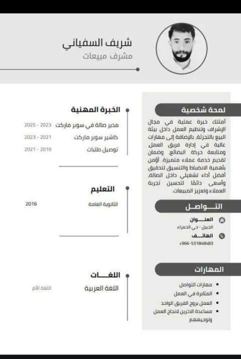 متخصص في المبيعات والدعم الاداري أجمع بين مهارات البيع والتسويق الرقمي وإدارة العملاء، مع اتقان الأنظمة المحاسبية وبرامج Excel وWord وCanva. لدي خبرة في إدارة المخزون، الاشراف العملي، وحل المشكلات بمرونة وسرعة. اعمل بروح المسؤولية وأسعى لزيادة المبيعات وبناء علاقات مهنية ناجحة