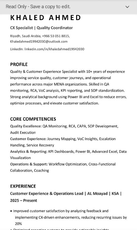بدور حاليا على فرصة شغل في Customer Experience Quality Operations. معيا أكثر من 10 سنين خبرة في شركات كبيرة زي Delivery Hero (Talabat) Noon، OSN, KFG. خبرتي تشمل QA، VoC، CSAT، SLAs، KPIs وتحسين تجربة العميل من Pre & Post Sales لحد Customer Support. كمان عندي خبرة في إدارة السوشيال ميديا، صناعة المحتوى، وتطوير ظهور الأنشطة على منصات زي HungerStation وMrsool وNinja
