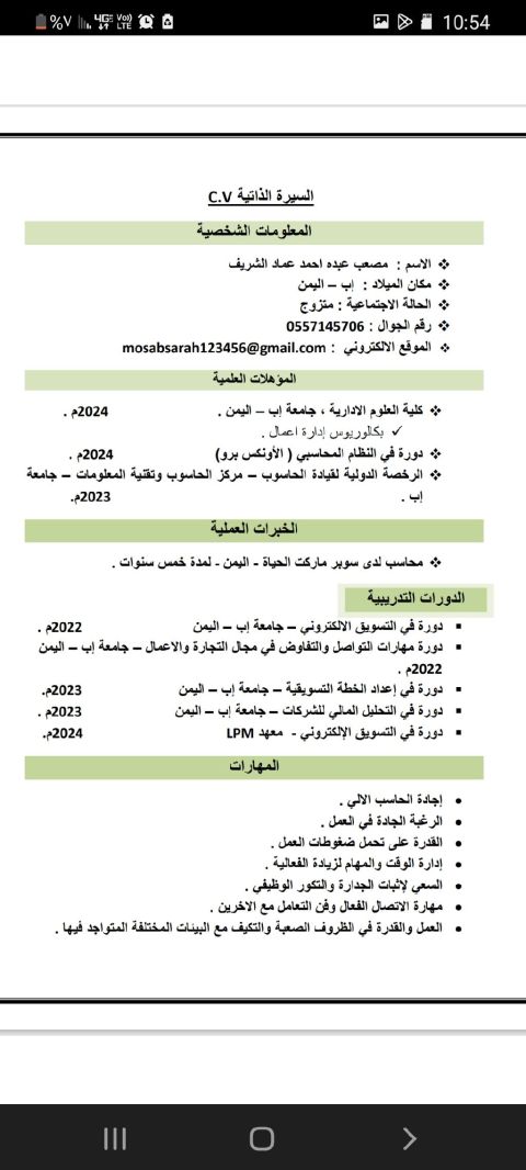 الاسم/ مصعب عبده الشريف يمني الجنسية أحمل شهادت إدارة الأعمال وأنظمة وخبرة 5 سنوات في سوبر ماركت الحياة وأحمل لغة انجليزيه وإقامة ورخصة قيادة