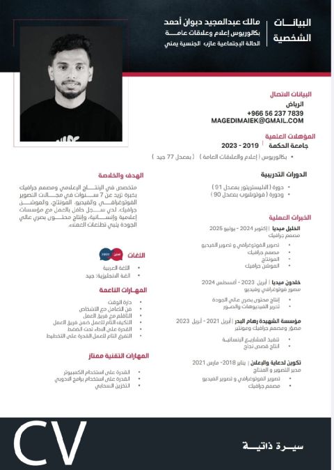 أنا عبد الرحمن فازع مصور خبرة 6 سنوات، لدي المعرفة الكاملة في أدوات التصوير من كاميرات (سوني، كانون، نايكون، السينمائية) وحوامل (درون، كرين، رونين، أستدي كام) أجيد التصوير القدموا والفيديو (سينمائي، وثائقي، احتفالات، موديلز وغيرها) لغتي الانجليزية لا بأس، امتلك لباقة الكلام وأتعامل بإحسان، أثق في جودة عملي وأبدع فيه وأعتبره كل حياتي، أريد وظيفة ولك ألحق في تجربة عملي، وأسال من الله التوفيق