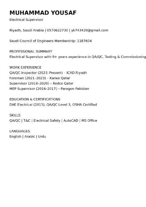 QA/ QC Civil Engineer with 8 + years of hands - on experience in quality control, inspection, and compliance of civil, structural, and architectural works across high - rise buildings, luxury villas, hospitals, residential compounds, and Industrial projects in Saudi Arabia. Proven ability to ensure strict adherence to project specifications, international standards, and Saudi construction regulations