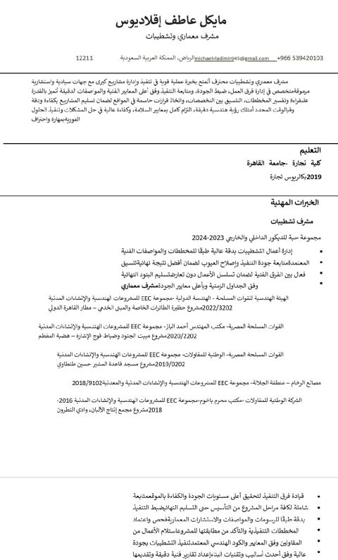 مشرف ومراقب مشاريع مقاولات كبيرة خبرة أكثر من 10 سنوات أجيد التعامل بالمواقع وحل الإشكاليات وتسليم العمل للمهندسين والاستشاريين ومشتريات مواد البناء للمواقع ولدي خبرة كافية بالأعمال الانشائية الخرسانات. عملت على ادارة أكثر من 300 عامل وترتيب السكن والترحيل وتنسيق الغرف السكنيه والاهتمام بنظافة السكن أجيد التعامل مع العمالة من كل الجنسيات العربية والأسيوية إقامة قابلة اللنقل رخصة قيادة سعوديه سارية