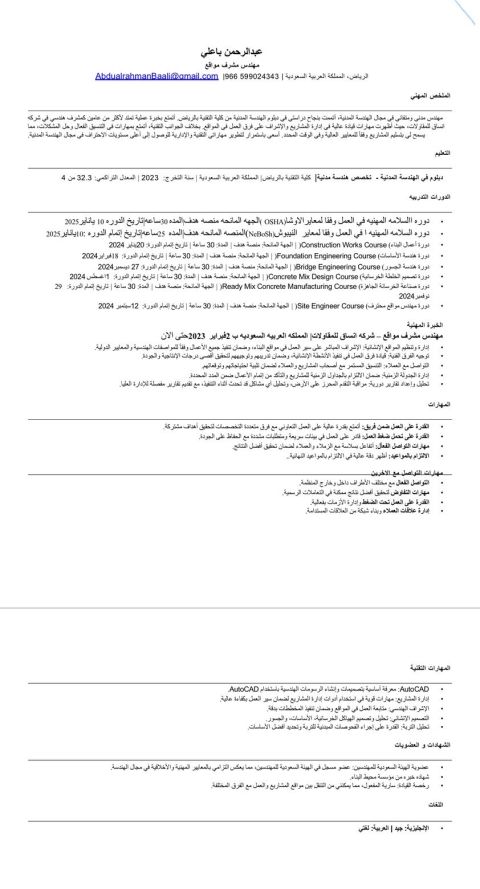 أنا لدي دبلوم هندسة مدنية سعودي خبرة ثلاث سنوات في تنفيذ أعمال التشطيبات والبنية التحتية، وإدارة مراحل المشروع من الحفر الى التسليم. متمكن من قراءة المخططات وضبط الجودة. ملتزم في السلامة المهنية والعمل الجماعي لتحقيق أفضل النتائج ومصنف من الهيئة السعودية للمهندسين
