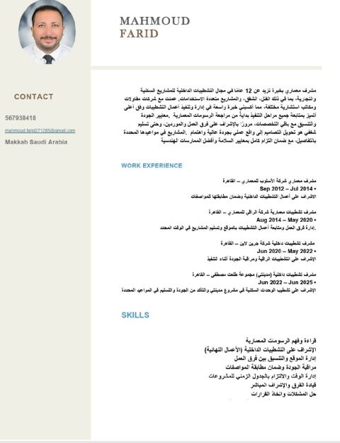 مشرف تشطيبات بخبرة عدد سنوات في تنفيذ وإدارة مشاريع التشطيبات السكنية والتجارية في الرياض. امتلك خبرة واسعة في الاشراف على أعمال اللياسة والدهانات والأعمال الجبسية وغيرها من البنود التشطيبية، مع الالتزام بأعلى معايير الجودة والسلامة. أتمتع بمهارات قوية في إدارة فرق العمل، وتنسيق مهام المقاولين، وحل المشكلات لضمان التسليم في الوقت المحدد وضمن الميزانية المخصصة