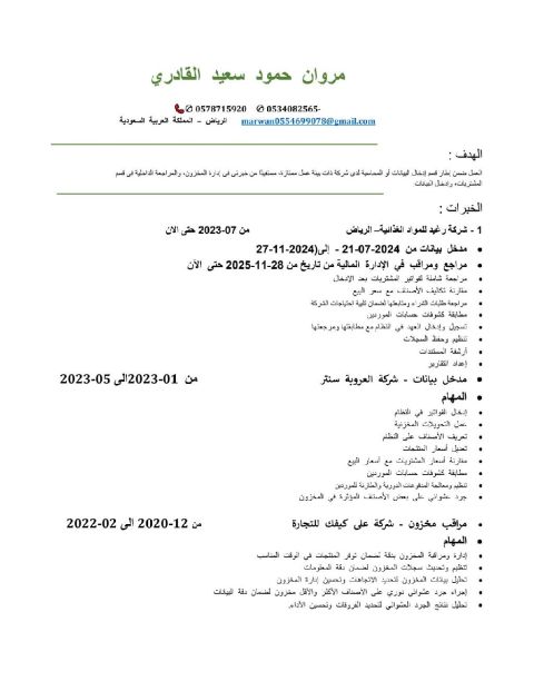 مدخل بيانات وفواتير لمؤسسات ومستودعات مواد غذائية سوداني الجنسية خبرة أكثر من 5 سنوات مؤهل جامعي مقيم في جدة الصفا إقامة سارية ورخصة قيادة ولا مانع من الانتقال لأي مدينة أخرى للتواصل مكالمات