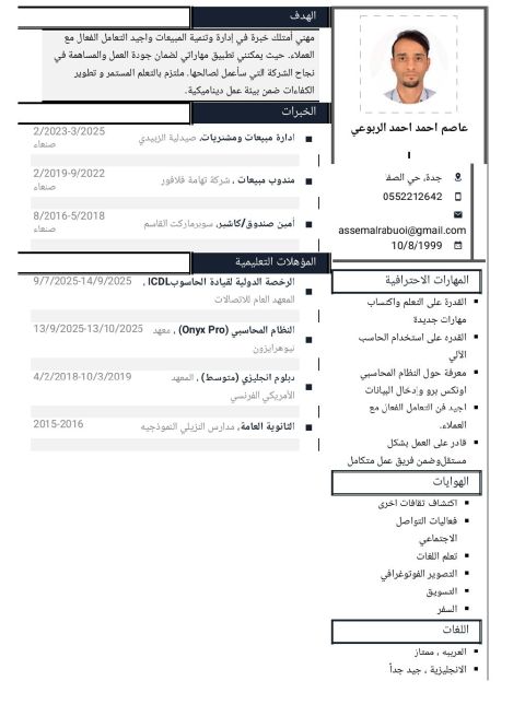 مهني امتلك خبرة في إدارة وتنمية المبيعات وأجيد التعامل الفعال مع العملاء. حيث يمكنني تطبيق مهاراتي لضمان جودة العمل والمساهمة في نجاح الشركة التي سأعمل لصالحها ملتزم بالتعلم المستمر وتطوير الكفاءات ضمن بيئة عمل ديناميكية