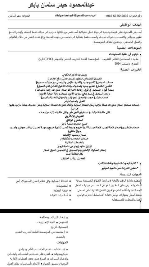 باحث عن عمل - موظف خدمات عامة شاب سوداني مقيم في السعودية، خريج تقنية معلومات (IT) ومحاسبة الكترونية، ابحث عن فرصة عمل في مجال الخدمات أو المكاتب. لدي خبرة عملية في انجاز المعاملات وخدمة العملاء اجادة استخدام الكمبيوتر والبرامج المكتبية والأنظمة سرعة في التعلم والتكيف مع بيئة العمل القدرة على تحمل ضغط العمل والالتزام بالمواعيد سبق لي وان عملت في مكتب خدمات، المكان حفر الباطن أجيد كل المنصات