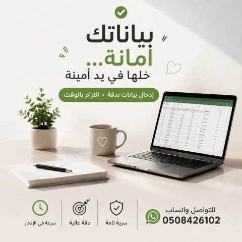 مدخل بيانات متاح للعمل (دوام كامل) امتلك خبرة في ادخال البيانات بدقة وسرعة عالية، مع اجادة استخدام برامج Microsoft Office خاصة Excel وWord. لدي مهارة في تنظيم الملفات، تدقيق البيانات، والالتزام بالمواعيد النهائية. أتميز بالتركيز، تحمل ضغط العمل، والالتزام بالسرية المهنية. جاهز للعمل فورا داخل المملكة أو عن بعد