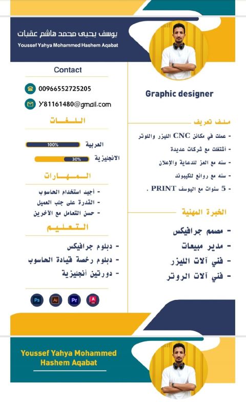 يبحث على عمل. مصمم ومشغل انتاج ذو خبرة، أجمع بين المهارة الابداعية في التصميم والخبرة التقنية في التشغيل والتنفيذ، متخصص في أعمال الدعاية والاعلان وتصنيع منتجات الاكريليك باستخدام أحدث التقنيات. المهارات والخدمات مجال التخصص الخدمات المقدمة التصميم الجرافيكي تصميم ستيكرات، بنرات، بروفيلات، شعارات، بوسترات، وتصاميم لوحات اعلانية. أعمال الاكريليك والديوراما تصميم وتنفيذ دروع التكريم ودروع التخرج