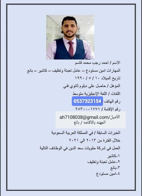 ابحث عن وظيفة. يمني الجنسية متواجد في الرياض. إقامة سارية المفعول خبرة مشرف أسواق ومساعد مشتريات وخبرة أمين صندوق (كاشير)