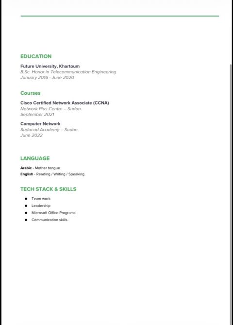 مهندس اتصالات سوداني. خبرة عام في الدعم الفني وجيد جدا في اللغة الانجليزية وعندي إقامة سارية ورخصة سارية