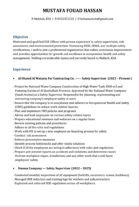 مراقب أمن وسلامه معتمد من شركة المياه الوطنيه حاصل علي شهادة والايوش وشهادة الاوشأ الأمريكية خبرة 6 سنوات في مجال السلامة والصحة المهنية مدقق داخلي خبرة في مجال البنيه التحتية وقادر علي أداء عمل فعال وأمن التعامل معا الشارع الرئيسي والتحكم المر وري ووضع التدابير طريقه عمل TBT وتدريب العمال وتقييم المخاطر والتفتيش الإقامة سارية وقابلة لنقل وجاهز للعمل فورا
