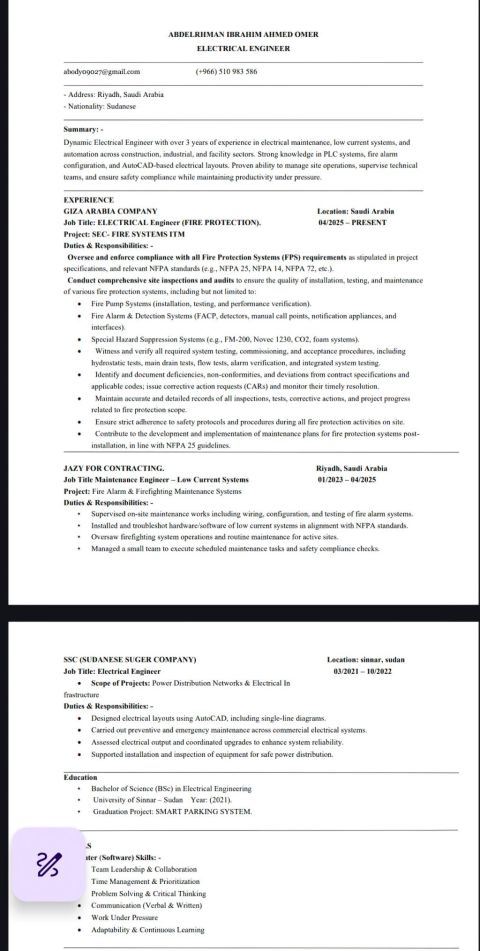 مهندسين. أنا مهندس أنظمة الحماية من الحريق خبرتي 5 سنوات ITM وكذلك مهندس مشاريع على مشاريع أنظمة الحريق خبرتي في مشاريع شركة الكهرباء السعودية الحمد لله عندي تصنيف شركة الكهرباء السعودية وحاليا على رأس العمل ابحث عن فرصة عمل وتكون الشركة مستقره رقم التواصل و