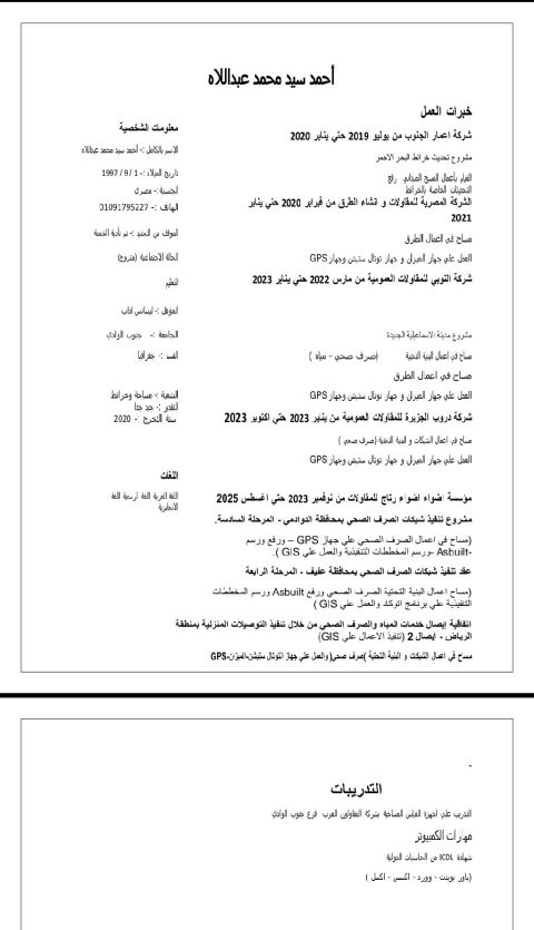 أحمد سيد محمد مساح دفعه 2020 - متزوج خبرة سنتين في المملكة في مشروعات شبكات المياه والصرف الصحي والتوصيلات المنزليه مساح موقع ومكتب فني وGIS وأعمال أل KMZ مسجل عضوية في هيئة المهندسين السعودية رخصة قيادة سارية معتمد في شركة المياه الوطنية NWC موجود داخل المملكة لا مانع من نقل الكفالة