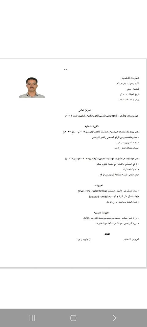 مساح ابحث عن فرصة تدريب في مكتب أو شركة استشارية بمقابل أو بدون مقابل، وذلك لاكتساب خبرة عملية في المعاملات الهندسية شغل المنصات (بلدي - احكام) الصكوك فرز الوحدات وغيرها من أعمال المكاتب الاستشارية لدي خبرة جيدة في استخدام الاجهزة المساحية وبرامج الهندسة، وأتقن العمل على الحاسب، ولدي رغبة قوية في التطوير واكتساب مهارات جديدة