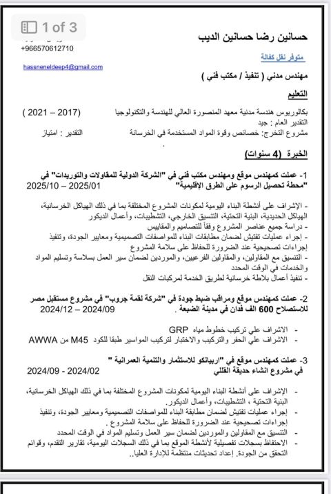 مهندس محمد عبد الناصر سعد مهندس مدني لدي خبرة فعلية تمتد لأكثر من 11 عاما في أعمال الإنشاءات والبنية التحتية وأعمال الصرف الصحي وشبكات المياه ومحطات معالجة مياه الصرف الصحي، عملت مسبقا كمساعد مدير تنفيذي، لدي خبرة بمراجعة المخططات التنفيذية وخبرة في إدارة فريق العمل وضبط الجودة بالموقع، ولدي اقامة نظامية، اعتماد هيئة المهندسين، حاصل علي شهادة أل PMP