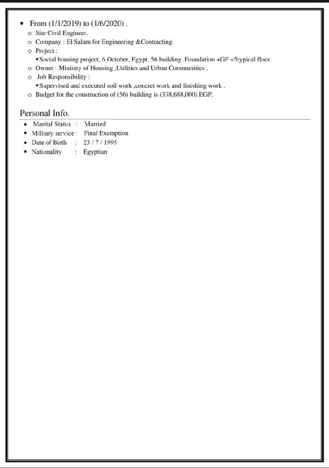 مهندس مدني حديث التخرج، شغوف بمجال الإنشاءات وإدارة المشاريع، امتلك أساسا علمياً قويا في التصميم والتحليل الانشائي، وأسعى للانضمام الى بيئة عمل احترافية تمكنني من تطوير مهاراتي والمساهمة في تنفيذ مشاريع عالية الجودة وفق أعلى المعايير الهندسية