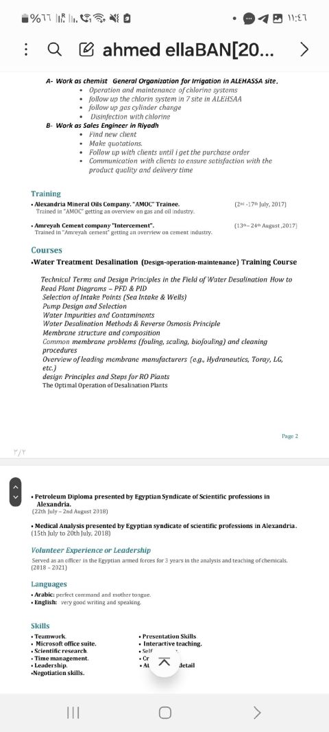 I am a Chemistry graduate (Alexandria University, 2018) with experience in water treatment. I worked as a Sales Engineer at Taameed Water Treatment and currently work at NOMAC as a Project Coordinators Supervisor. I also completed a 12 - session Water Treatment course. I am seeking a water treatment position and am ready to relocate anywhere in Saudi Arabia