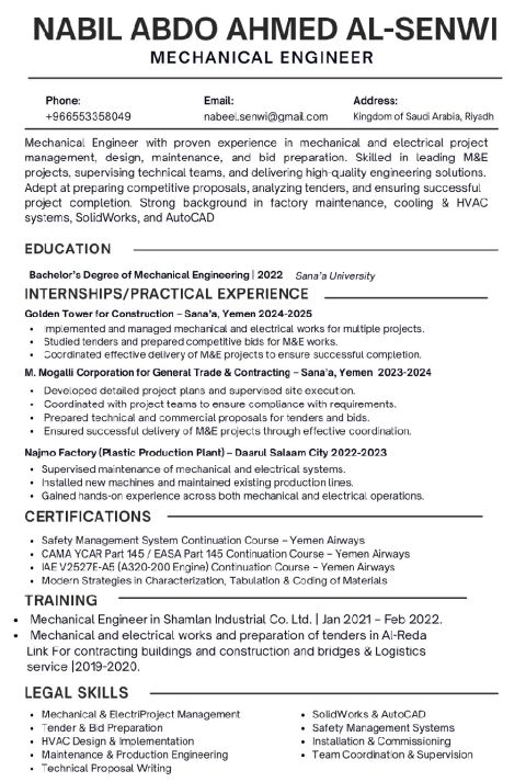Mechanical Engineer with proven experience in mechanical and electrical project management, design, maintenance, and bid preparation. Skilled in leading me projects, supervising technical teams, and delivering high - quality engineering solutions. Adept at preparing competitive proposals, analyzing tenders, and ensuring successful project completion. Strong background in factory maintenance