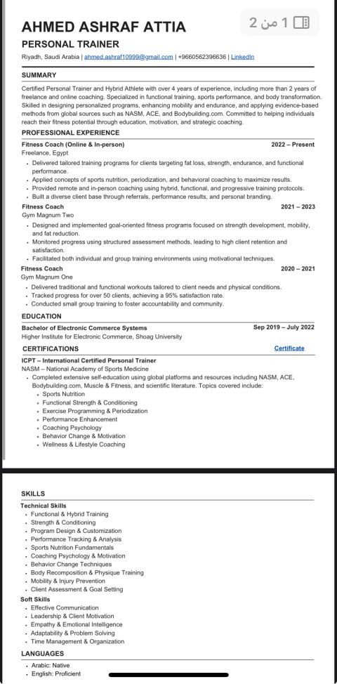 مدرب جيم - Trainer / Fitness Coach أحمد أشرف - مدرب لياقة بدنية محترف، خبرة في تصميم برامج تمارين مخصصة، خطط تغذية، وتحفيز العملاء لتحقيق أهدافهم. ملم بأساليب التدريب الحديثة وتحسين الأداء البدني، مع معرفة في التغذية الرياضية. شغوف بالرياضة، ملتزم، ومرن للعمل تحت الضغط. جاهز للعمل فورا بدوام كامل أو جزئي في الرياض