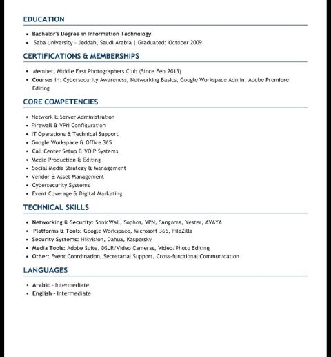 مهندس دعم فني وتكنولوجيا معلومات يتمتع بالحافزية والخبرة في بروتوكولات الشبكات وبني الشبكات التحتية، وتشخيص المشكلات المتعلقة بالاجهزة والبرمجيات. متقن للعمل على أنظمة التشغيل والتطبيقات الشائعة، وأقدم دعما فنيا فعالا يسهم في تحسين أداء الأنظمة