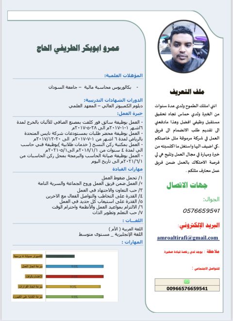 أنا مهندس حاسبات وتحكم، وشبكات وبرمجة ابحث عن فرصة عمل في السعودية في أحد المجالات التالية البرمجة، الشبكات، الأنظمة الذكية، أو المبيعات التقنية. لدي خبرة ودورات في المجالات التالية برمجة التطبيقات باستخدام Flutter تطوير الأنظمة المحاسبية بلغة C قواعد البيانات SQL Server شهادة CCNA في شبكات الحاسب خبرة في المبيعات والتعامل مع الاجهزة الالكترونية جاهز للعمل في أي مدينة