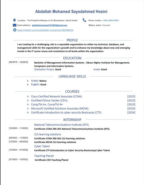حسن IT support Specialist بخبرة سنتين. مختص دعم فني (IT support) حاصل على بكالوريوس نظم معلومات. خبرة سنتين في حل مشكلات الاجهزة والبرامج بسرعة وفعالية. لدي خبرة مثبتة في تقليل أعطال النظام الى الحد الأدنى وزيادة رضا المستخدمين. مستعد لدعم التحول الرقمي وضمان التشغيل السلس لجميع الأنظمة